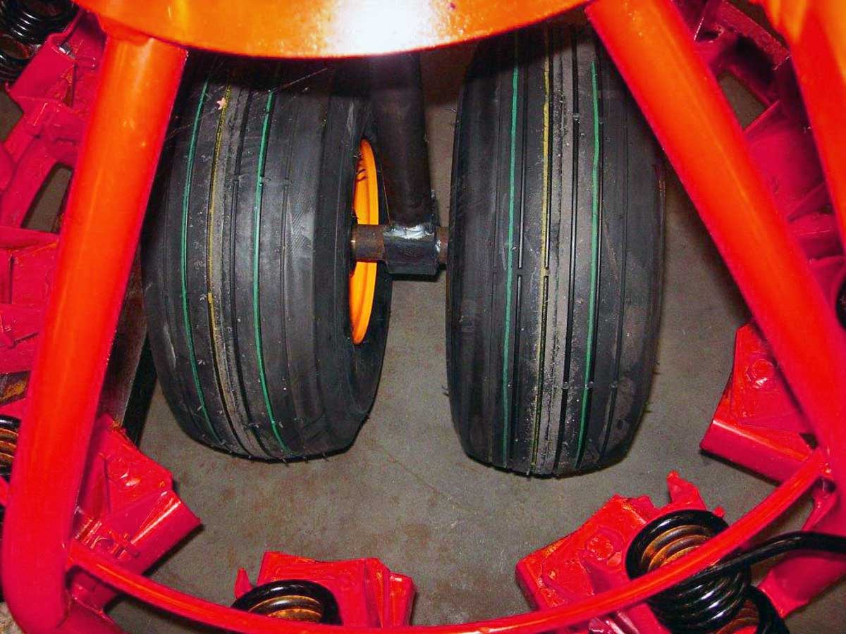 Der RV-Schwader ist in 2 Größen mit einer Arbeitsbreite von 3,0 m oder 3,9 m und standardmäßig mit 2 oder 4 Rädern erhältlich. Der Schwader ist mit einer kardanischen Aufhängung zwischen den Rotoren ausgestattet, um Stillstand zu vermeiden.
