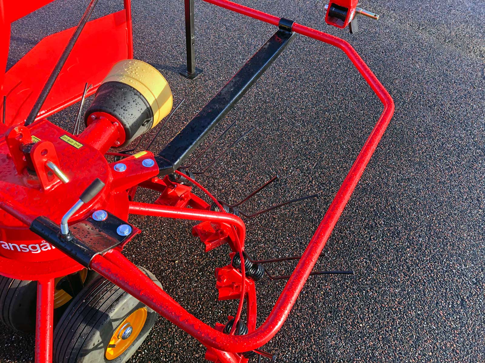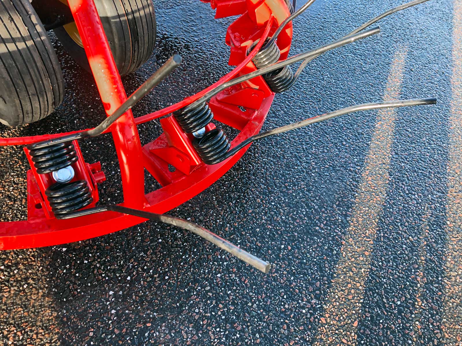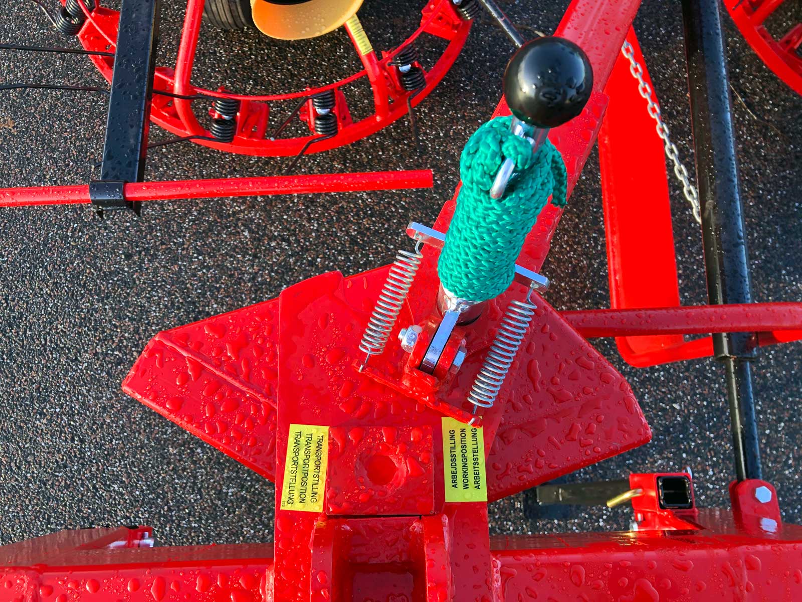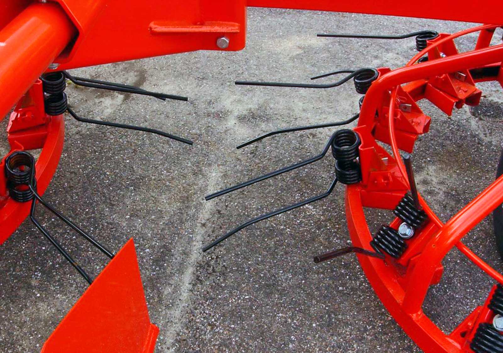 Die Zentrifugalkraft drückt die Federn nach unten in die Arbeitsposition. Wenn sie auf einen Stein oder ein Loch im Feld stoßen, schlagen sie auf dem Boden auf, anstatt diesen zu durchdringen. Während des Transports wird der Schwader manuell hinter den Traktor gedreht.