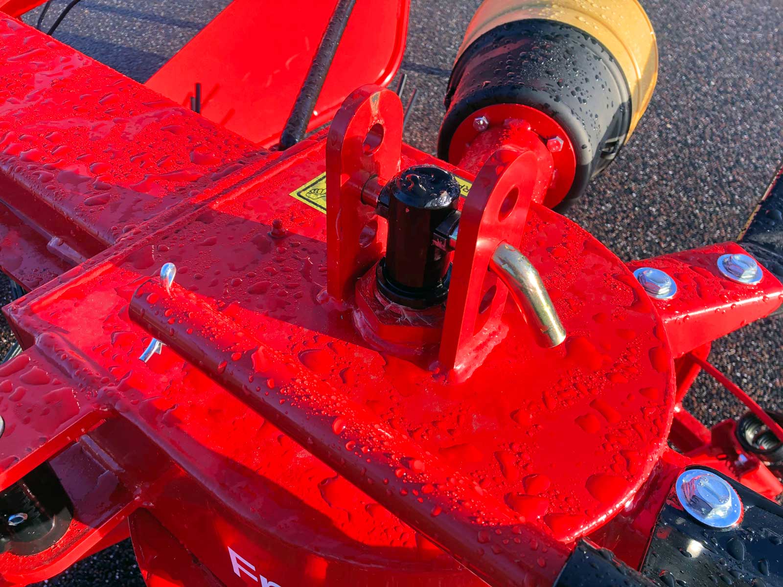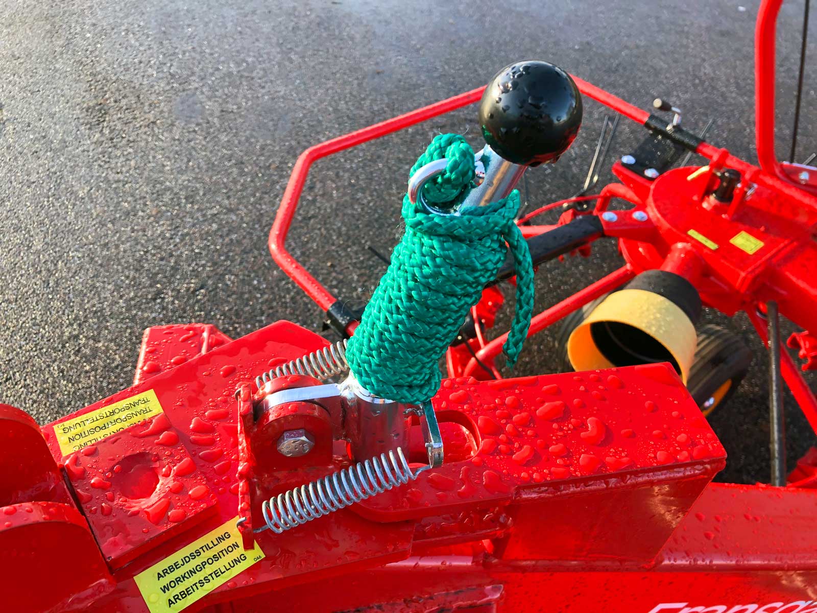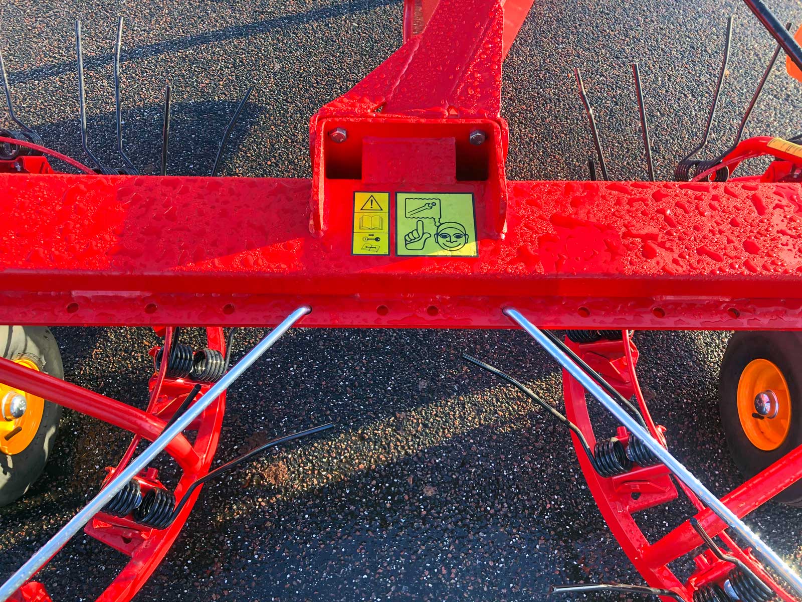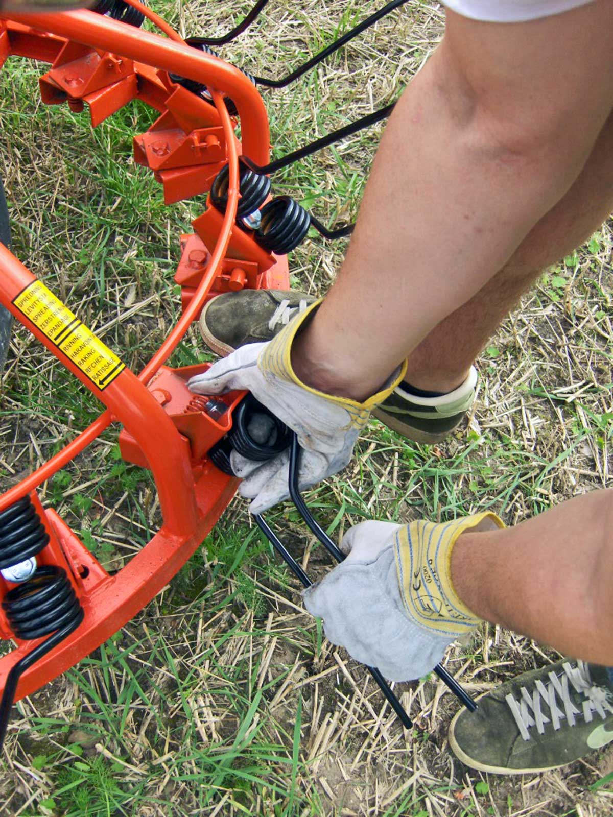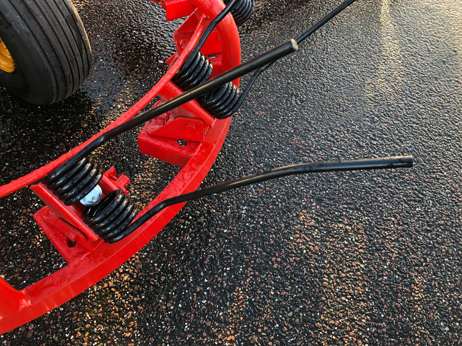 Die Zentrifugalkraft drückt die Federn nach unten in die Arbeitsposition. Wenn sie auf einen Stein oder ein Loch im Feld stoßen, schlagen sie auf dem Boden auf, anstatt diesen zu durchdringen. Während des Transports wird der Schwader manuell hinter den Traktor gedreht.