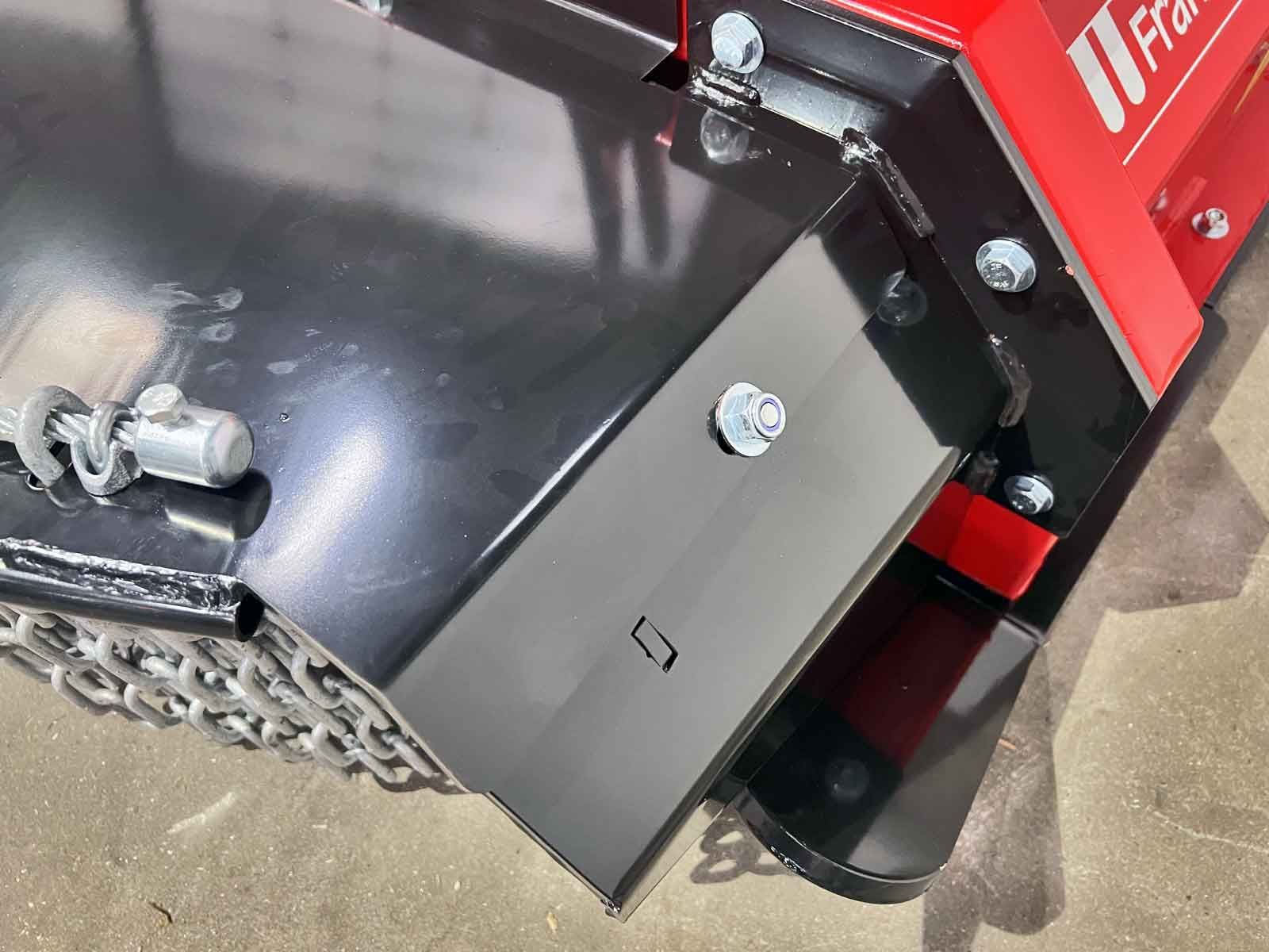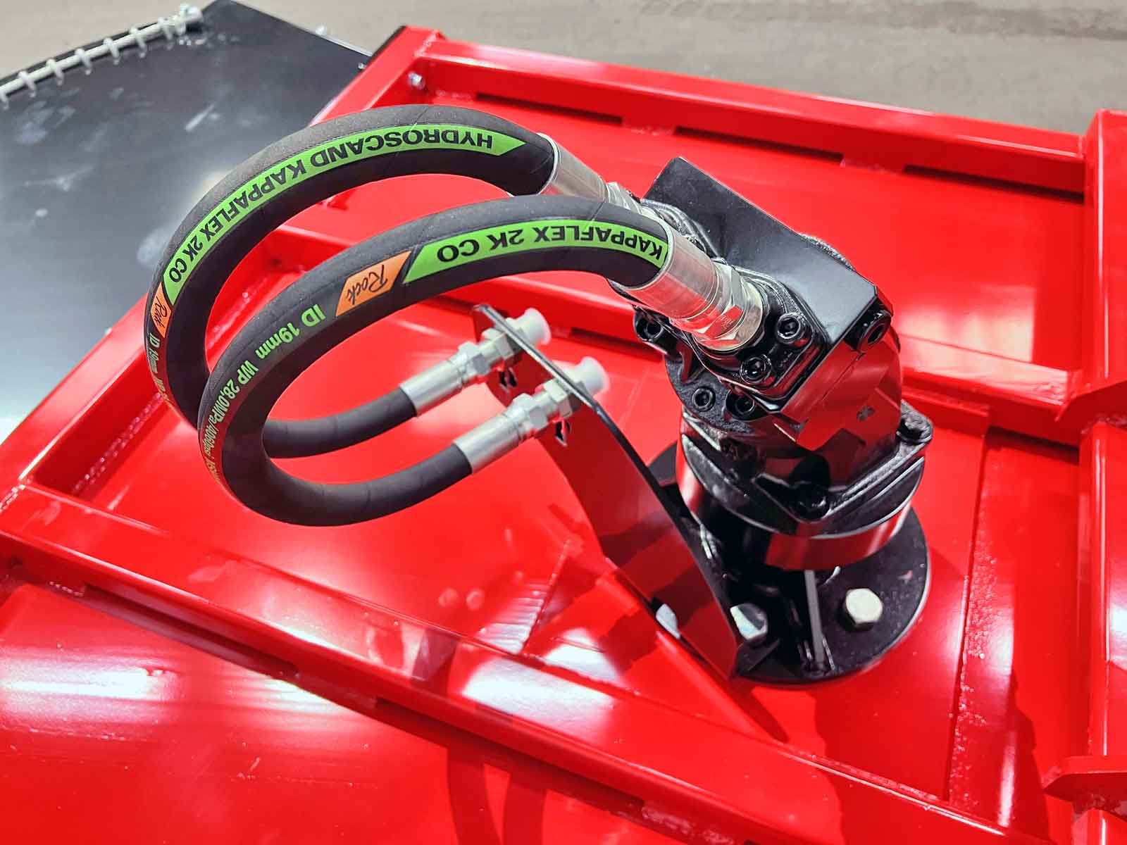 Chain guards are mounted at both ends, enabling optimal use of the machine by swinging the crane or boom arm back and forth. The mower is fitted with 2 or 4 steel chains in G100 quality, rotating at a speed of 1600 RPM. The hydraulic motor is a new and much more powerful version compared to earlier models.