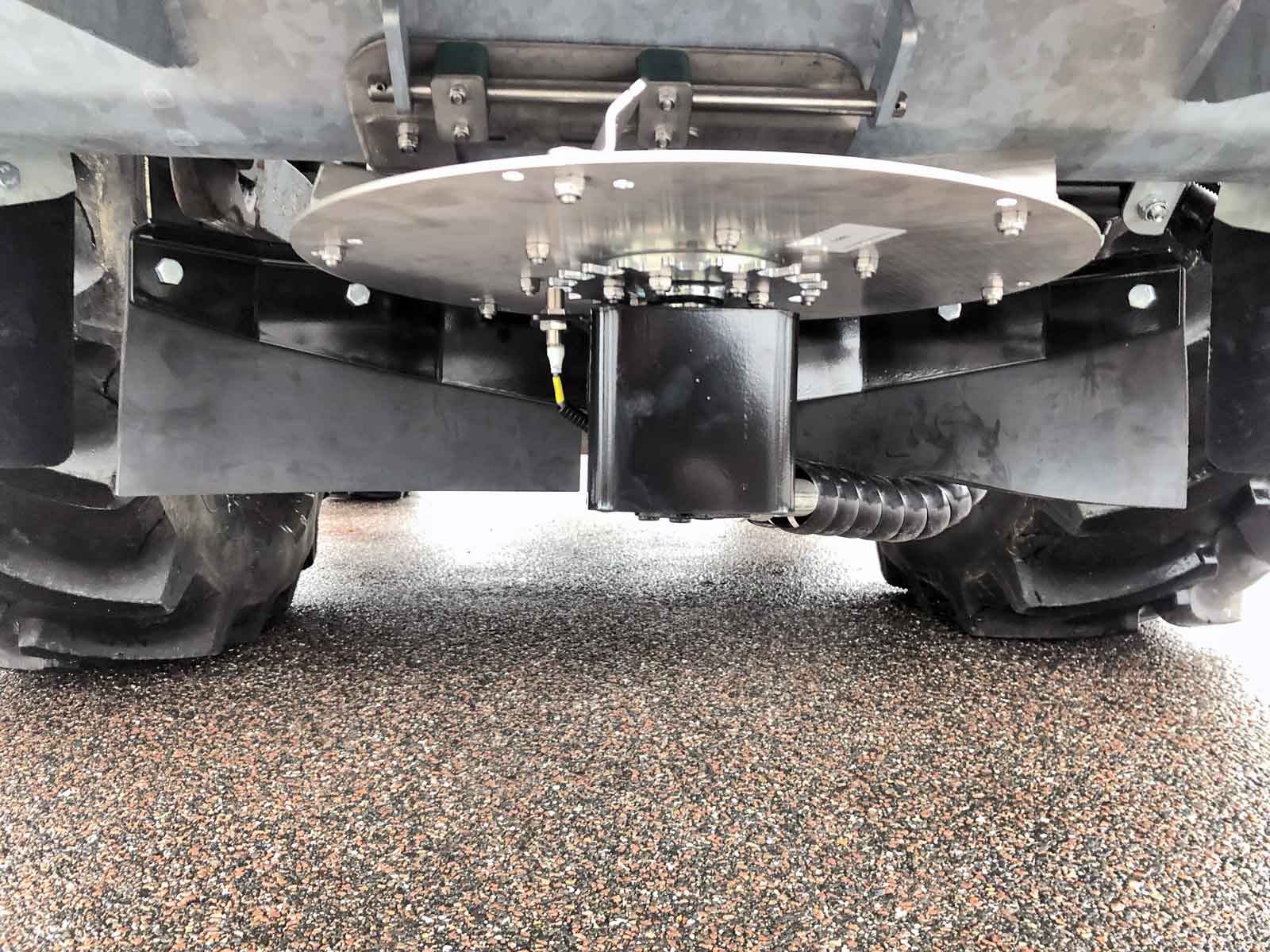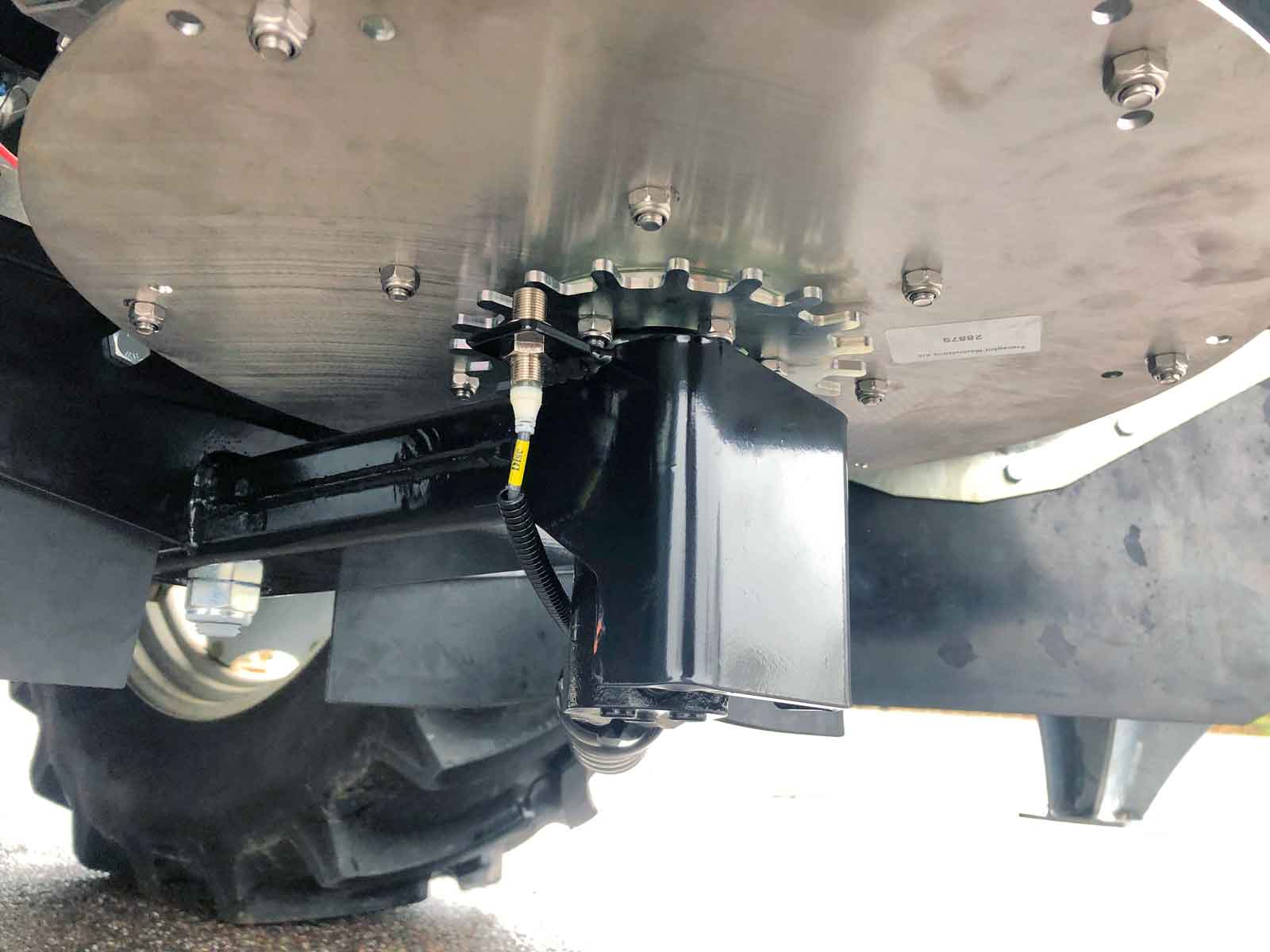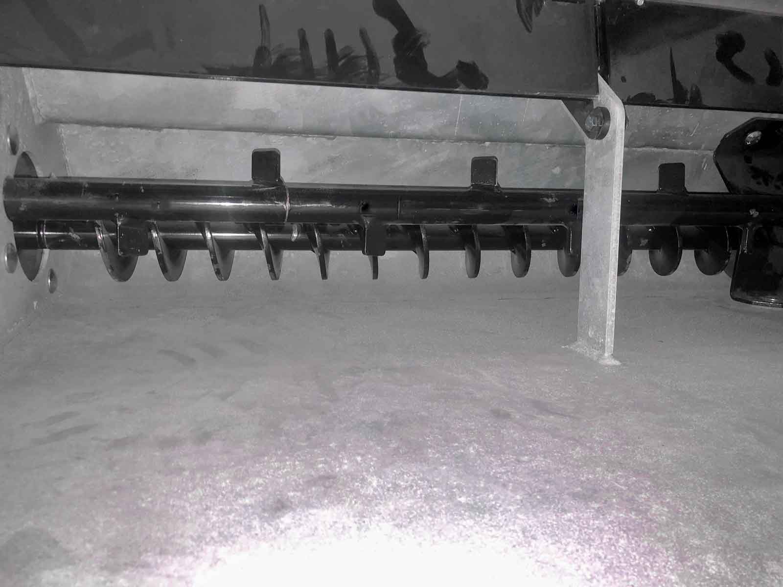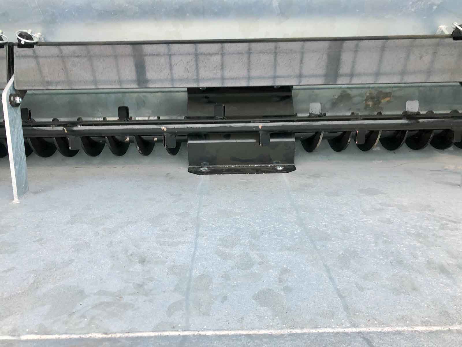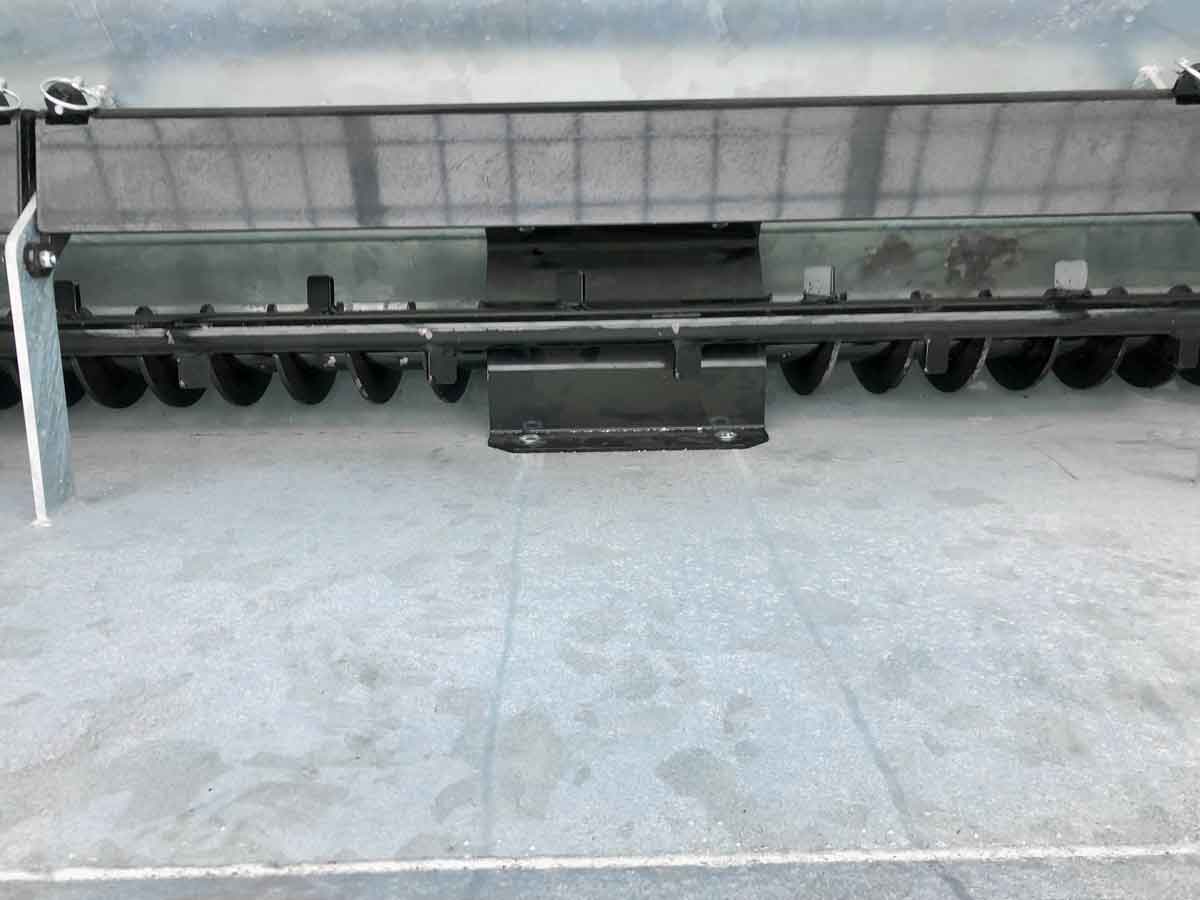 The spreader box is made of high strength steel (Domex 420) with wear steel on the top and bottom. The disc and closure fitting are made of stainless steel. The machine has a powerful hydraulic motor and a chain drive with a powerful tension wheel for operating the auger and agitator. The diameter of the auger is the minimum and grows steadily in size (progressively) towards the centre of the spreader to the disc. This provides a smoother flow of material to the disc, reducing the risk of clogging and reducing wear on the parts.
