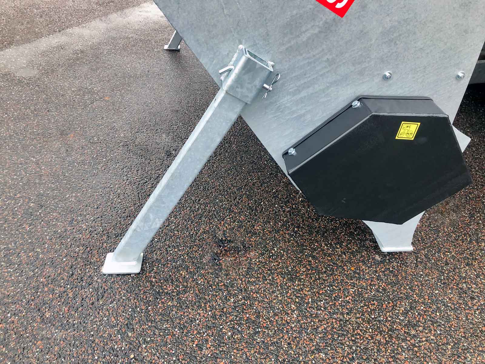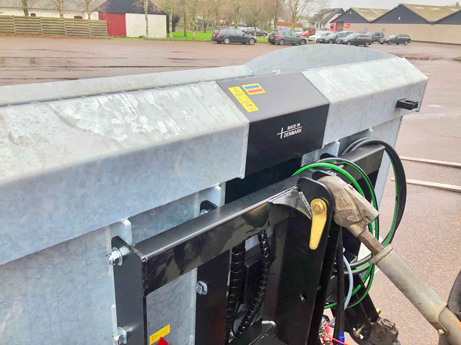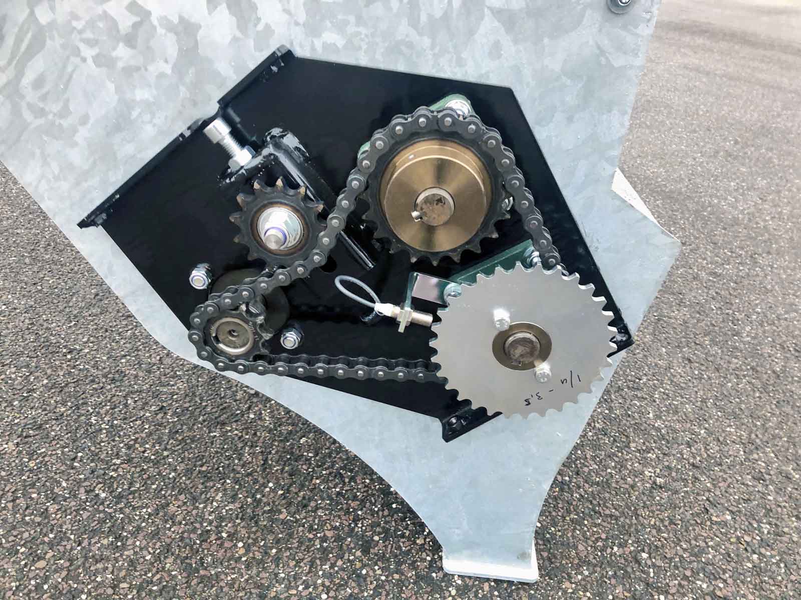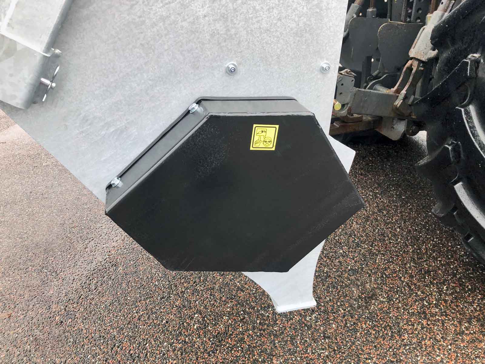 The spreader box is made of high strength steel (Domex 420) with wear steel on the top and bottom. The disc and closure fitting are made of stainless steel. The machine has a powerful hydraulic motor and a chain drive with a powerful tension wheel for operating the auger and agitator. The diameter of the auger is the minimum and grows steadily in size (progressively) towards the centre of the spreader to the disc. This provides a smoother flow of material to the disc, reducing the risk of clogging and reducing wear on the parts.