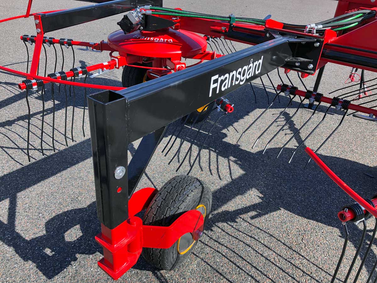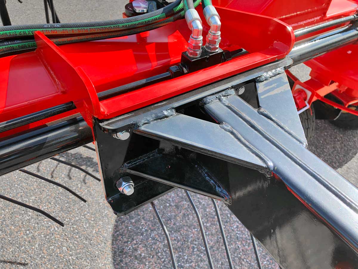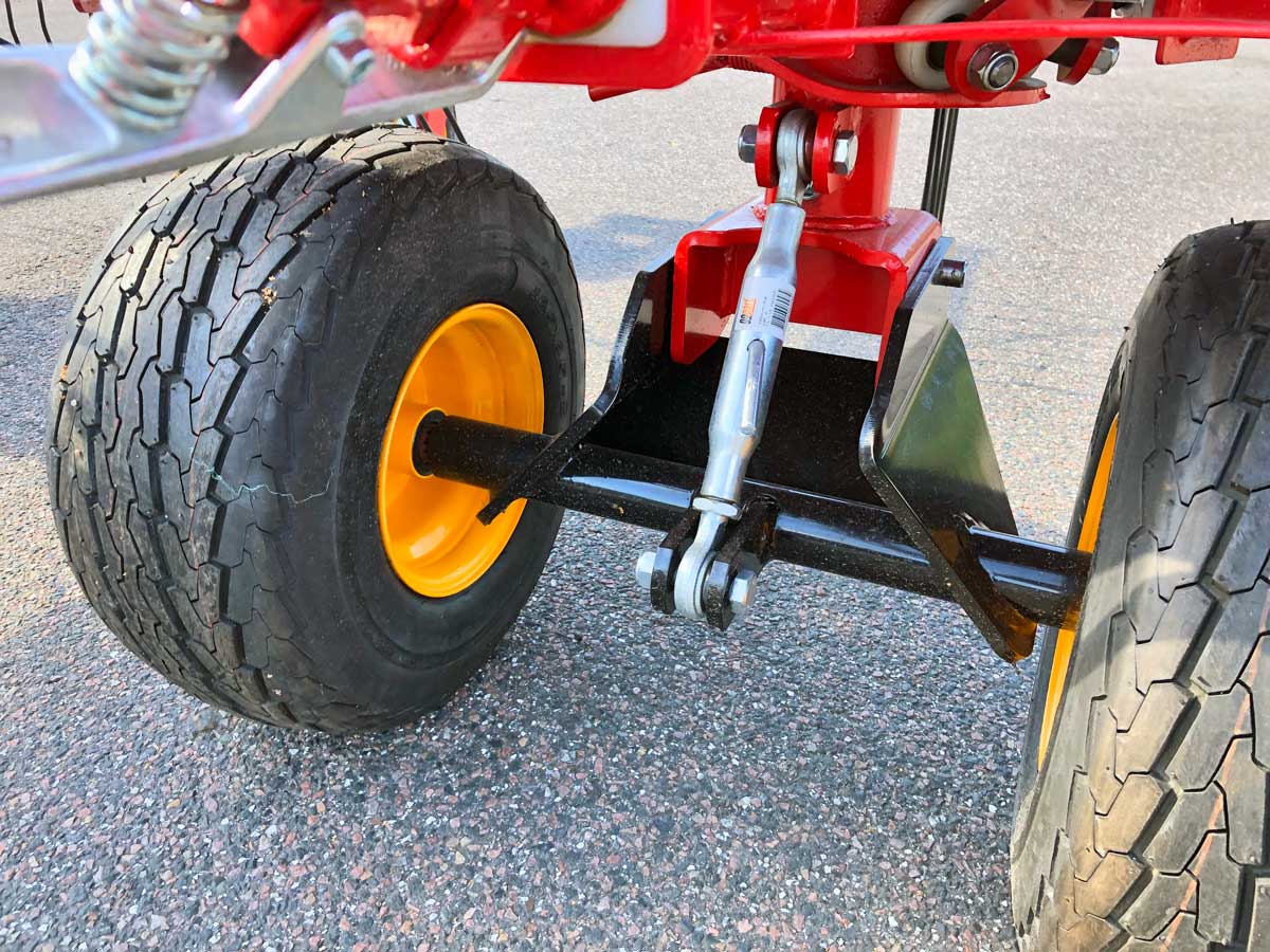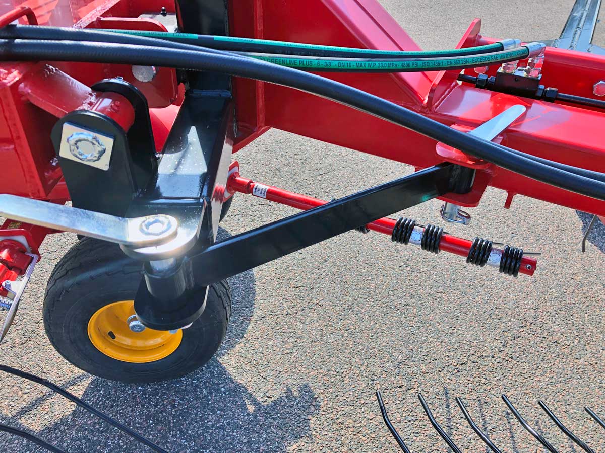Stepless height adjustment of wheels and angle of rotors. Removable arms without the need for tools. The rake is prepared for front wheels (optional extras), which are always recommended for hilly terrain.