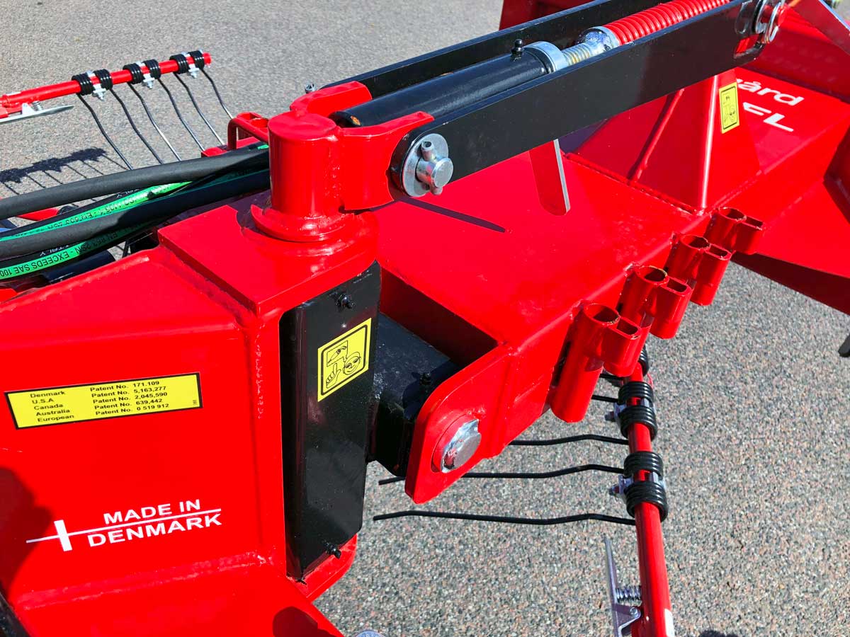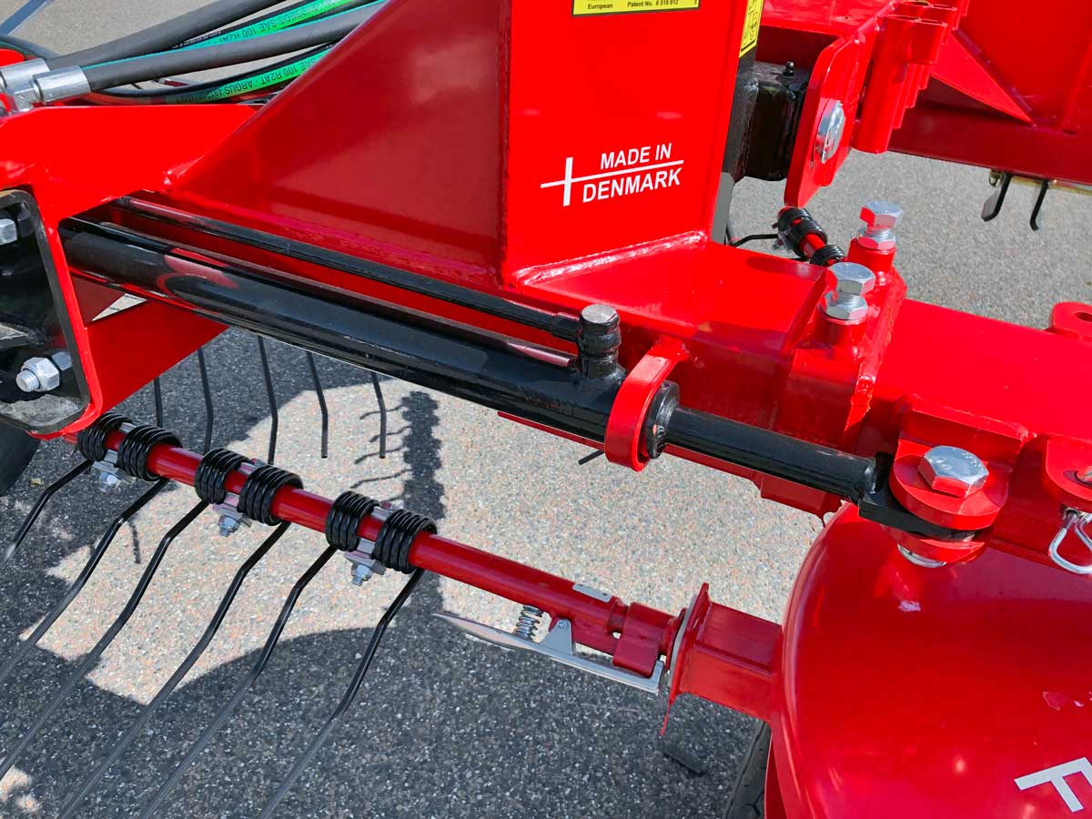 The width of the rake is hydraulically adjustable, and the swath width can be adapted to the pick-up of the baler. A front-mounted rake also means no driving into the material first and provides optimum working comfort for the operator.
