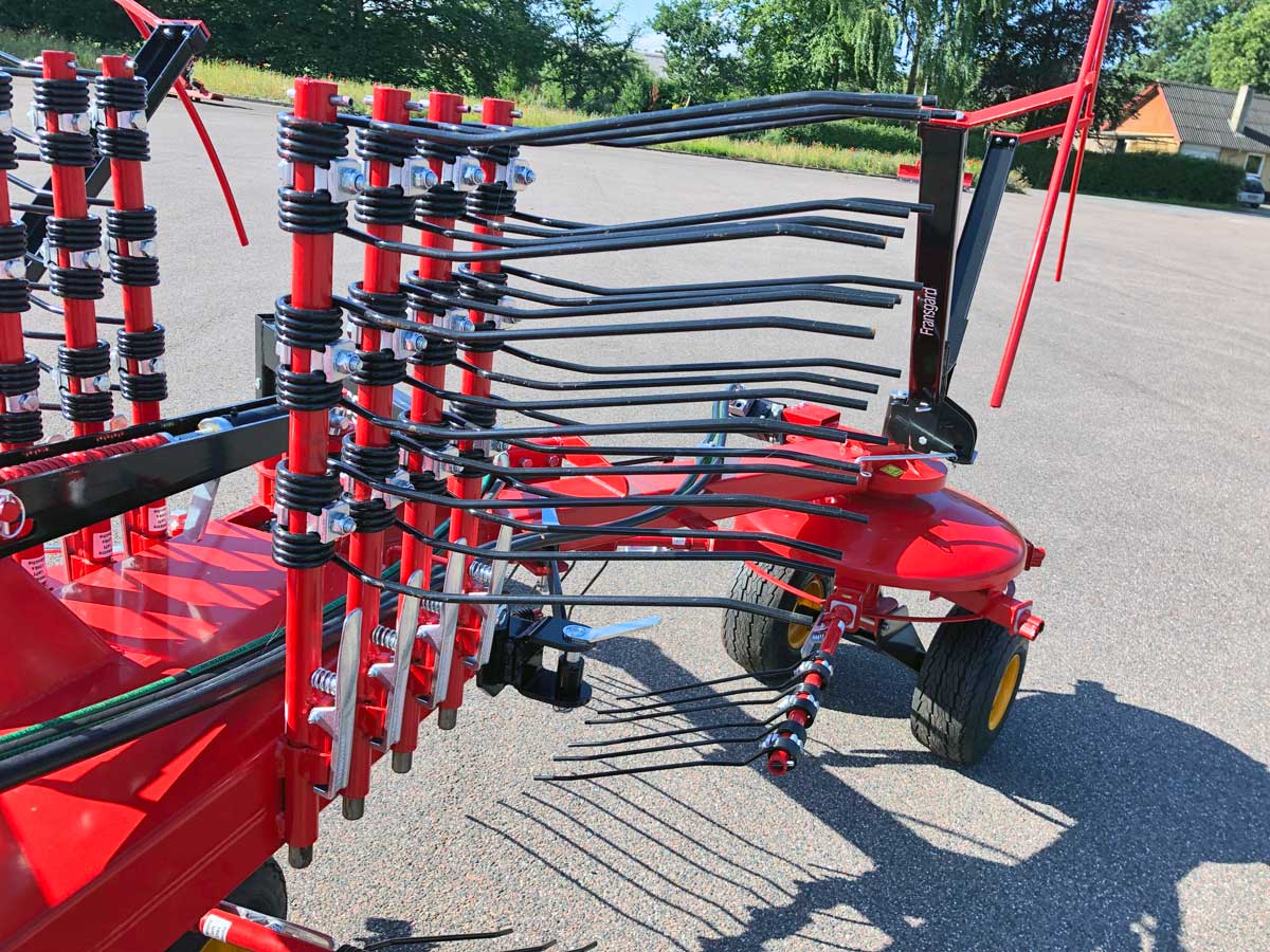 The rake is manually packed during transport and sticks out 3.5 m in front of the tractor.