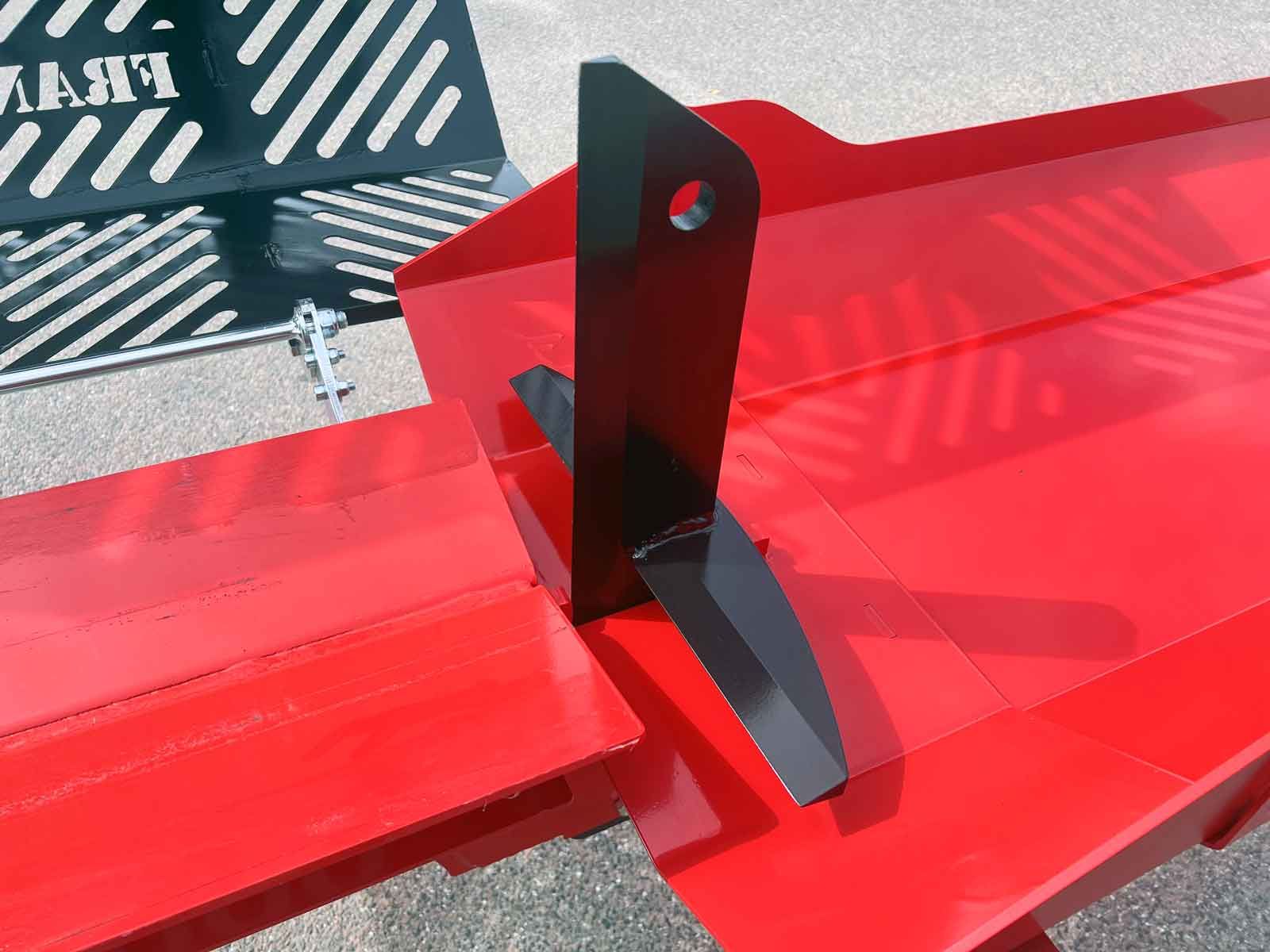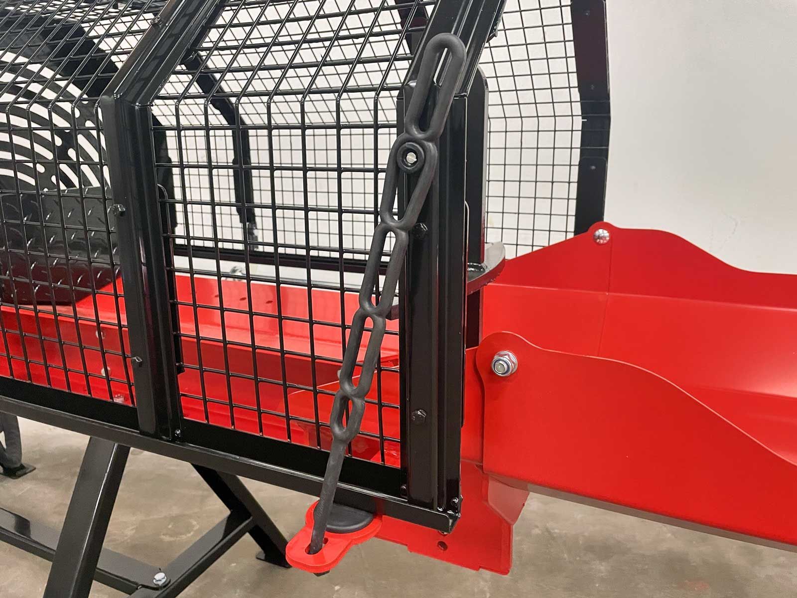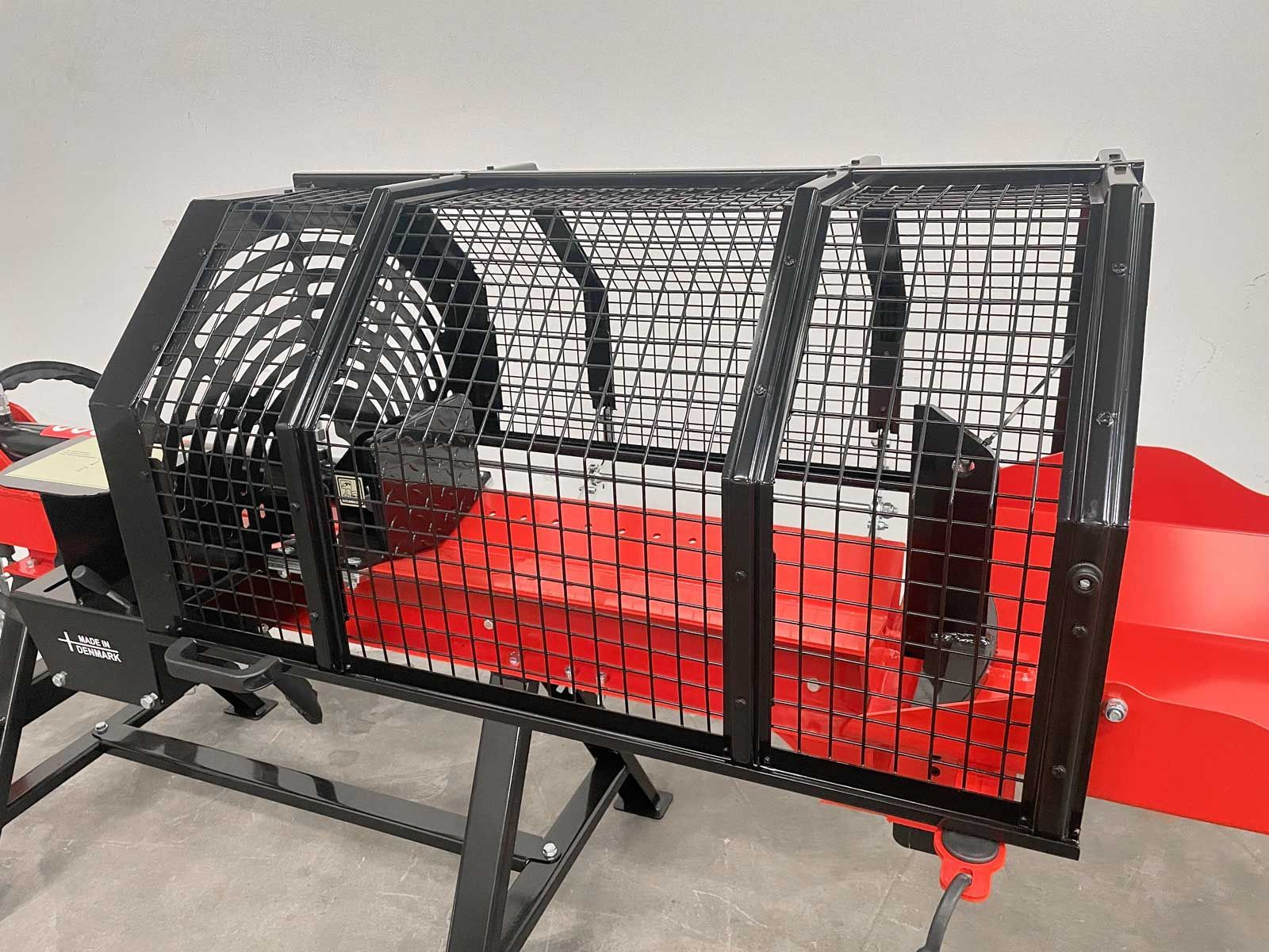 The machine is equipped with important safety features, ensuring it meets the latest and strictest safety standards for log splitters. A sturdy safety screen and two-hand operation minimize the risk of accidents during use.